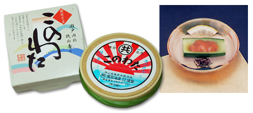 ![]() | なまこの腸の塩辛は、日本独特の珍味として「延喜式」に記事が出ています。宮中でも珍重されていたそうです。 少量を茶わんに入れ熱燗の酒をそそいでいただくと風味豊かな「このわた酒」ができます。また、温かいご飯に添えても美味しくいただけます。 【期間限定】 新このわた(冷蔵物) 販売価格:時価 |